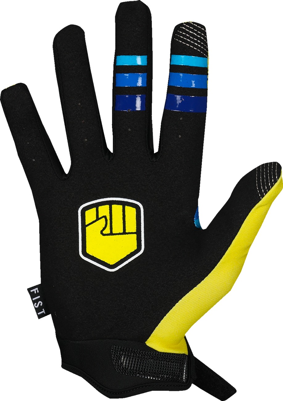 FIST Handwear Strapped 90s Gloves deliver lightweight control and all-day comfort for BMX, MTB, and MX riding. A pre-curved Clarino® palm provides durable wear and excellent feel at the controls, while the sublimated twill spandex upper keeps airflow high and comfort supreme. Tacky silicone print on the palm and fingers boosts lever and bar grip, even in wet conditions. A short-cuff design with a hook-and-loop wrist closure makes for a secure, streamlined fit.