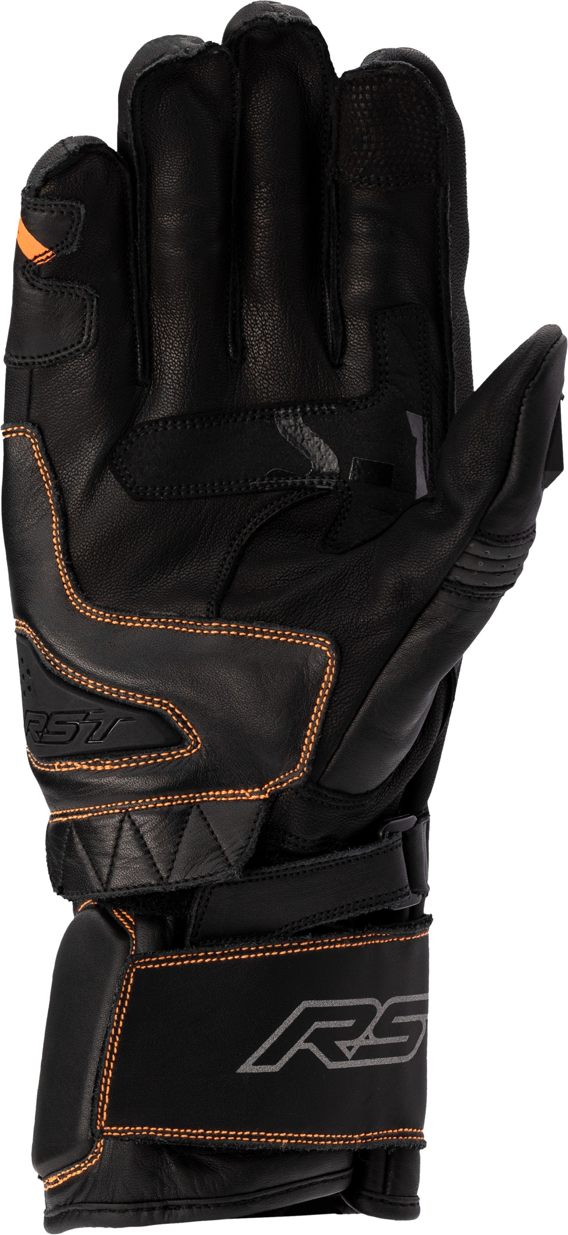 The RST S1 CE Glove in Black/Grey/Neon Orange (size XL) is a high-performance sport glove designed for street riding. Part of the S-1 product family, it is engineered for both comfort and protection. The glove features a floating carbon knuckle, palm slider, thumb and TPR finger protection, and a double layer of leather at the palm. Outstitched, pre-curved fingers and perforated motion panels offer enhanced flexibility, while the full grain leather construction with Amara and polyester lining ensures durability. The glove is CE Certified to Level 1 KP and includes a hook and loop double wrist closure for a secure fit.