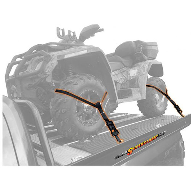 Secure your ATV or UTV with confidence using the Superclamp ATV/UTV Strap Kit. This all-in-one kit includes 4 heavy-duty ratchet tie down straps, 4 genuine Superclamp deck hooks, and a convenient storage bag. The unique lasso with "D-Ring" design anchors your vehicle by the tires, not the frame or racks, eliminating compression on suspension components. Each strap features a large rubber coated handle for comfort and a large J-hook with a safety clasp for maximum security. With a working load rating of 1,300 lbs per strap (total 5,200 lbs), this kit is engineered for strength and reliability. Suitable for tires up to 35" in diameter.