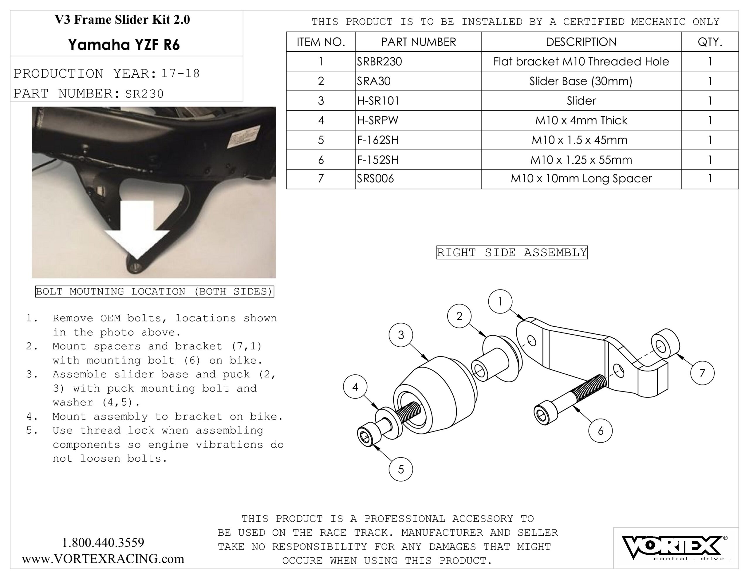 - Detailed assembly instructions are included, Vortex recommends that its V3 2.0 frame sliders be installed by a certified motorcycle mechanic