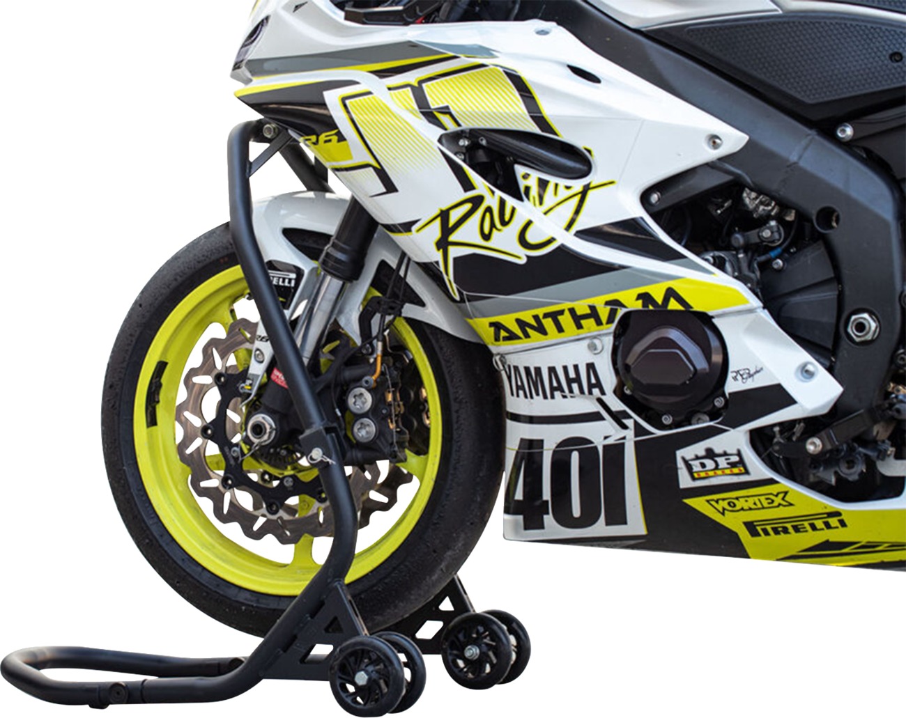 The Vortex Head Lift Front Stand in black is engineered for superior performance and style, making it a top choice for motorcycle maintenance and storage. Constructed from heavy-duty steel tubing, this stand features oversized 4.25" quad wheels with dual sealed bearings for stability and smooth operation. Its compact, break-down design allows for easy storage when not in use. The pivot angle ensures effortless lifting, while the plastic glide plates protect the stand’s tubing. This kit includes five interchangeable lift pins (13, 15, 16.5, 17, and 18 mm) to fit most sportbike applications. Additional pins (sold separately) are available for even more versatility, covering 19, 20, 21, 23, 24, and 27 mm sizes. Ideal for both home garages and professional workshops, the Vortex head lift stand provides reliable support for front-end maintenance, tire changes, and storage.