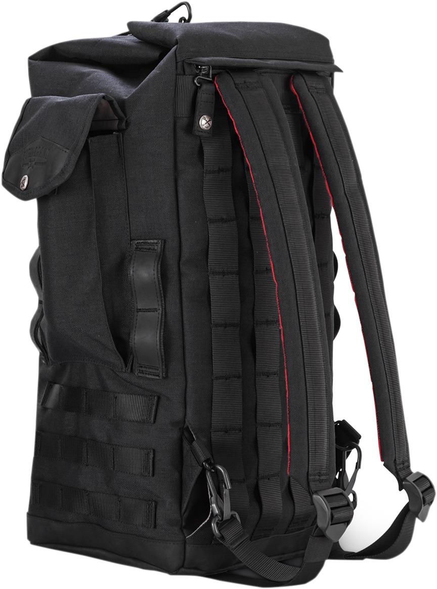 The Burly Brand Voyager Sissy Bar Backpack is a durable and stylish motorcycle bag designed for versatility and secure attachment. Made from Black CORDURA with leather paneling, it offers long-lasting support that develops character over time. This backpack features three convenient carrying options: hidden backpack straps for hands-free use, a leather-wrapped side grab handle for duffel-style carrying, and two tie-down straps that secure the MOLLE system to most sissy bars. High-quality moto-centric zippers, metal Burly embossed button snaps, and an “Anti-Flail Snap System” ensure everything stays secure while riding. Dimensions: 16.5″ tall (when closed) and 9″ wide.