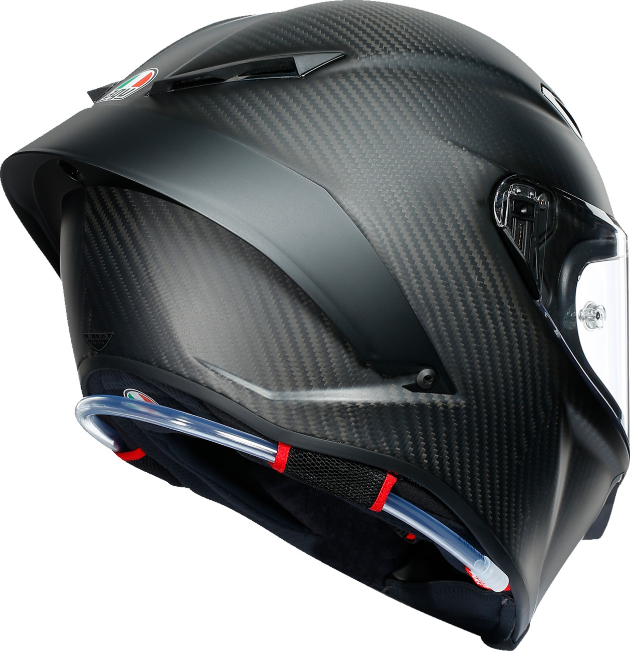 The AGV Pista GP RR Mono Helmet delivers top-tier race technology for riders seeking the ultimate in protection and performance. This FIM-homologated, DOT and ECE 22.06 certified helmet features a 100% carbon fiber shell and 5-density EPS structure designed to minimize rotational accelerations. Its advanced aerodynamics include a detachable PRO spoiler and race suit fitment. The interior is completely customizable with removable and washable pads, a 360° adaptive fit, and instant sweat absorption via the 2Dry system. The helmet offers a wide 190° horizontal and 85° vertical field of view, anti-scratch visor, and includes a Pinlock® 120 MaxVision™ insert. Accessories such as a hydration system, interior customization kit, tear-off kit, and vent covers are included. Additional features: titanium Double D retention system, premium comfort fabrics, cheek pad safety release system, and metal visor mechanism. Color: Matte Carbon Black. Size: Medium.