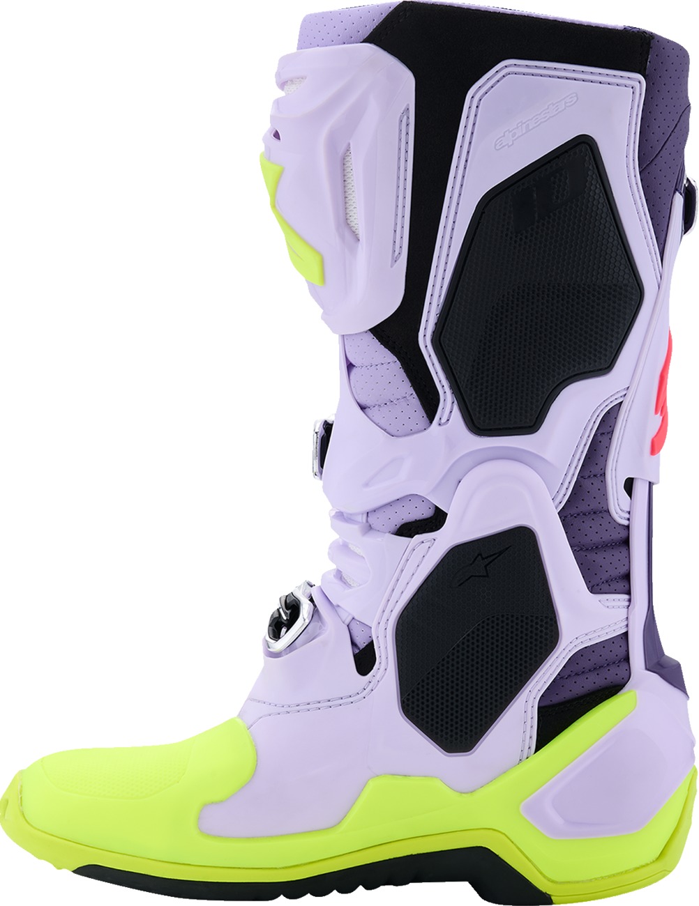 The Alpinestars Tech 10 Supervented Boots in Purple, Fluorescent Yellow, and Diva Pink (US 10 / EU 44.5) deliver advanced performance, protection, and cooling for motocross and off-road riders. These boots feature highly breathable, perforated microfiber construction and ventilated padding for optimized airflow. A new air flow system sole, large front inlet ports, and rear exhausts provide superior ventilation and heat exchange. The double pivot motion control system enhances flexibility, precision, and impact protection, while the exclusive TPU panels and redesigned sole maximize grip and durability. Additional features include a replaceable sole insert, anatomical buckle closure, anti-sliding suede heel lining, and a patented Dynamic Heel Compression Protector (DHCP) to absorb high-impact energies. The boots are ergonomically designed for comfort, support, and secure fit, making them ideal for demanding riding environments.