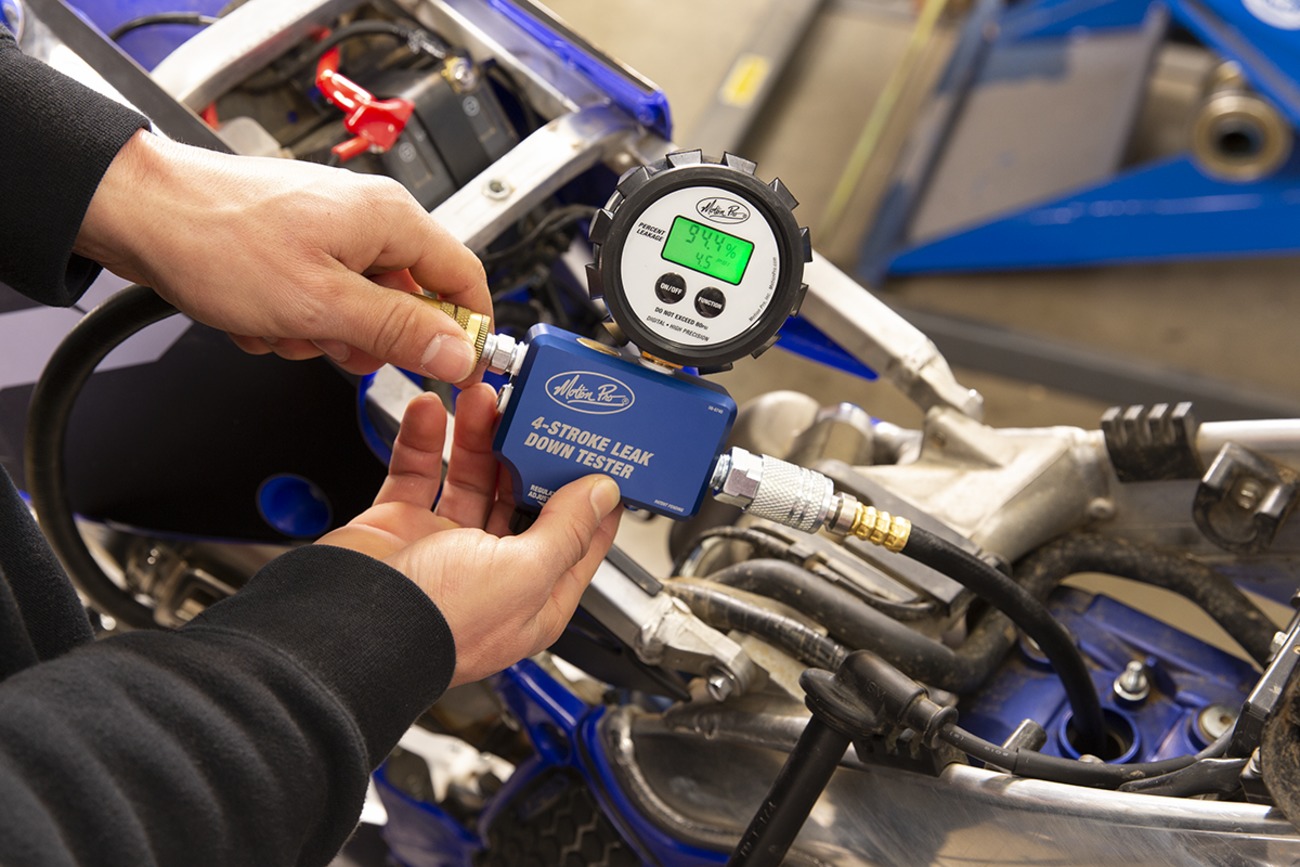 The Motion Pro Digital 4-Stroke Leak Down Tester Kit is a precision diagnostic tool designed to help you accurately assess the condition of your engine. It displays the total percentage of leakage past rings, head gasket, and intake or exhaust valves, helping you quickly pinpoint potential engine issues. The tester meets FAA leak down test specifications for cylinders below 5.00" (127 mm) bore diameter. It tests at 80 PSI cylinder pressure (requires 90 PSI air source). The included hose and adapters fit 10 mm, 12 mm, and 14 mm spark plug threads, making it compatible with most 4-stroke engines. The digital display provides easy-to-read, accurate results, and the built-in precision pressure regulator ensures consistent operation. Comes with a rugged rubber boot to protect the digital gauges, a 1/4" male industrial quick connector, molded tray, and instructions. Ideal for both professional and DIY mechanics.