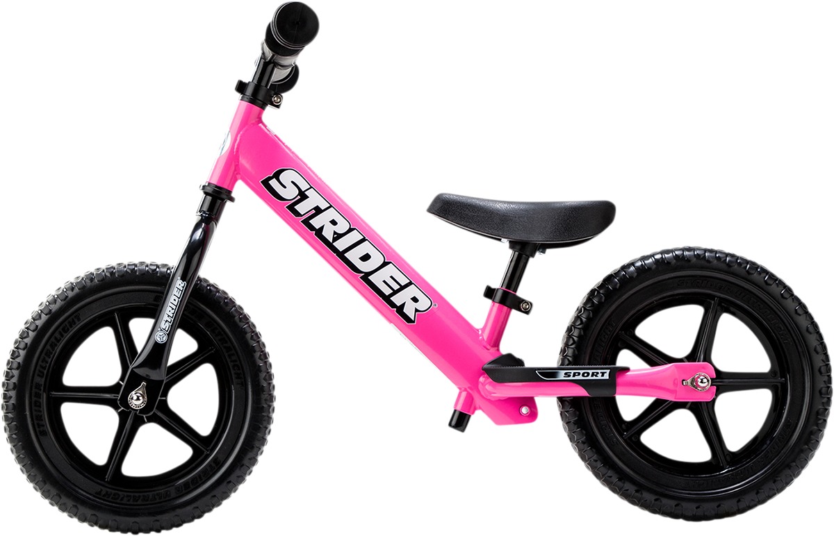 The Strider 12 Sport Balance Bike in Pink is an industry-leading training bike designed to help children as young as 18 months learn to ride on two wheels. With its simple, no-pedal design, kids focus on balancing, leaning, and steering without the distractions of pedals or training wheels. The lightweight steel frame is durable yet easy for toddlers to handle, and the flat-free EVA foam tires never require air or repair. The bike features an ultra-light one-piece wheelset with sealed cartridge bearings, a padded adjustable mini-saddle, both standard and XL seatposts (seat height adjusts from 11" to 19"), and a handlebar height range of 18" to 22". A built-in footrest lets children practice balance, and the included learn-to-ride guide provides step-by-step instructions. With no-tool assembly and a U.S. patented design, this bike supports riders with inseams from 12" to 20" and up to 60 lbs. Perfect for building confidence and skills needed to transition to a pedal bike.