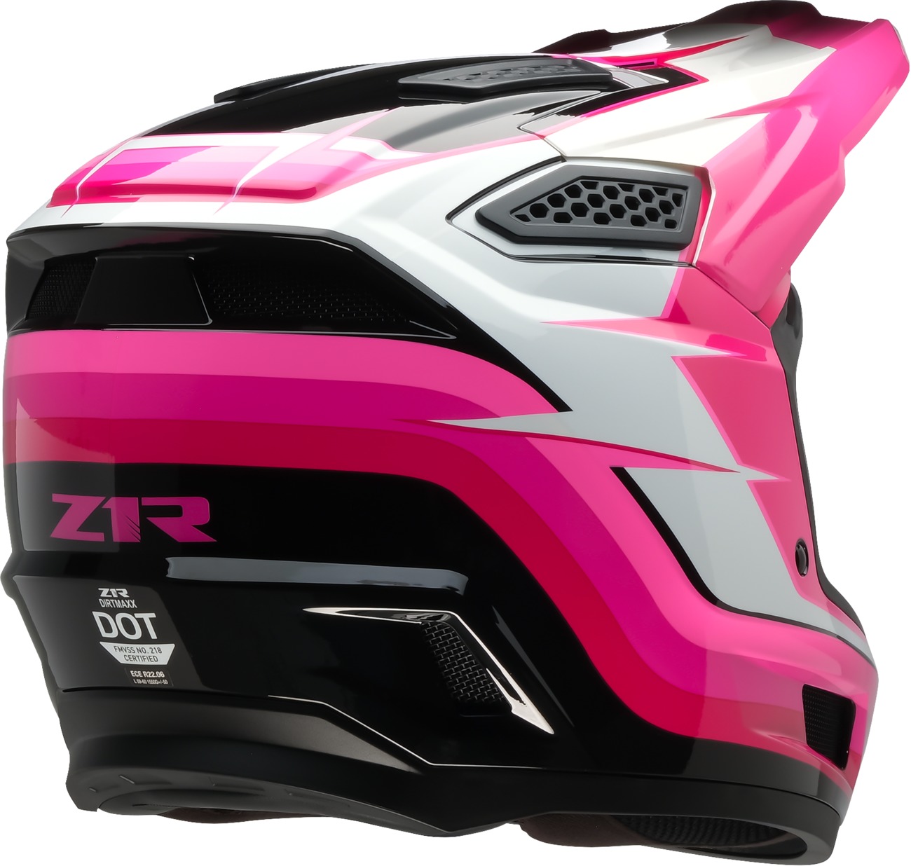 The Z1R Dirt Maxx Vortex Helmet in Pink/White (2XL) is designed for maximum comfort and protection on the track or trail. Featuring 13 intake and exhaust ports for optimal ventilation, the helmet utilizes an injection-molded polycarbonate shell for enhanced durability. The fully removable moisture-wicking polyester liner and cheek pads ensure easy cleaning and freshness, while the dual-density EPS liner offers advanced impact absorption. A secure D-ring chin strap retention system keeps the helmet in place during your ride. Ideal for motocross and off-road enthusiasts seeking both safety and style.