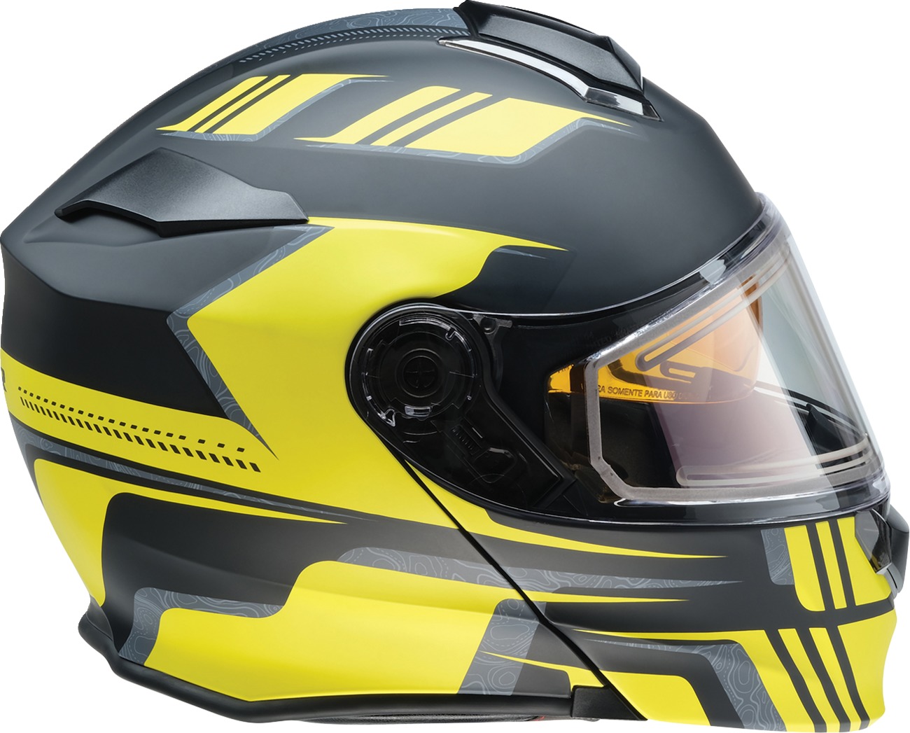 The Z1R Solaris First Tracks Modular Snow Electric Helmet is designed to keep you comfortable and protected in harsh winter conditions. Featuring an injection-molded polycarbonate shell, this helmet includes a dual-pane anti-fog electric shield and a standard shield for versatility. The micrometric helmet strap ensures a secure fit, while the amber color drop-down sun visor is easily activated using a side lever. Closable chin and top vents, along with a rear exhaust vent, provide increased airflow. The fully removable polyester moisture-wicking liner and cheek pads offer added comfort. Additionally, a removable breath box and chin curtain are included. Meets DOT FMVSS-218 Standard.
